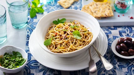 If you want to make it heartier, try pairing lighter vegetables. Sauté chopped asparagus or add some blistered cherry tomatoes for more of a saucy bite. If you want to add some richness to the pasta, shave some fresh parmesan or asiago cheese over the top. Compliment the flavors of the tapenade by finishing with a garnish of fresh-chopped tender herbs, like parsley, if you've got some in the fridge waiting to be used.
