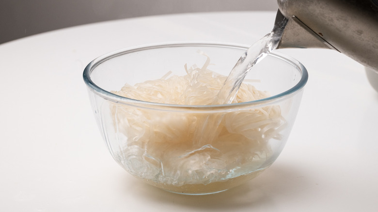 - In a large, heatproof bowl, add the noodles. Boil a kettle and pour the hot water over the noodles until they are just submerged. Leave them to cook according to the packets instructions.