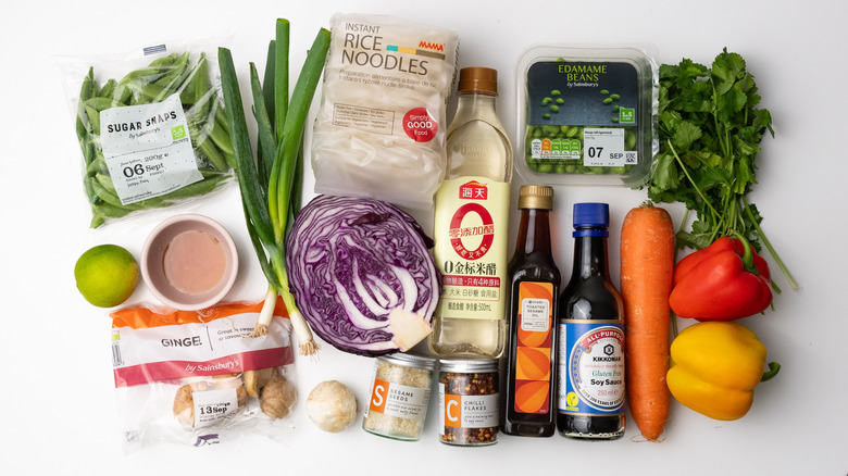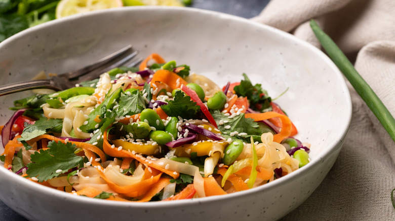 - In a large bowl, add the cooked rice noodles, sugar snap peas, sliced carrot, red cabbage, bell peppers, scallions, edamame beans, and cilantro.
