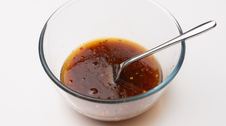 - Add the toasted sesame oil, ginger, garlic, lime juice, soy sauce, rice vinegar, honey, and chili flakes to a bowl and mix everything together to form the salad dressing. Set aside.