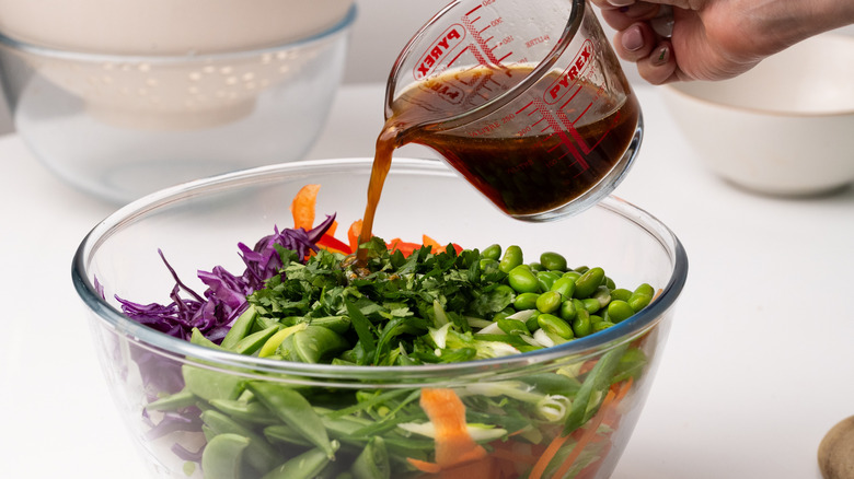 - Pour the mixed salad dressing over the ingredients in the bowl, and then toss everything together to thoroughly coat it in the toasted sesame dressing before serving. Top with sesame seeds when serving, if desired.