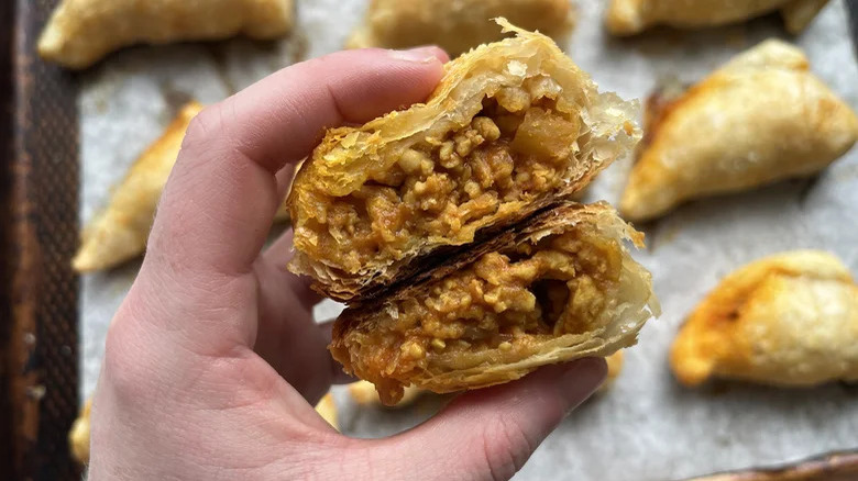 Perfectly portioned, these curry puffs perfectly fit the bill for hors d'oeuvres. Their size is ideal for a single, delightful bite or two, making them a hit at gatherings. Plus, they can freeze and bake as needed, catering to unplanned dinner parties or impromptu meet-ups. If you somehow have any leftovers, enjoy them as lunch alongside a crisp salad or blanched vegetables.