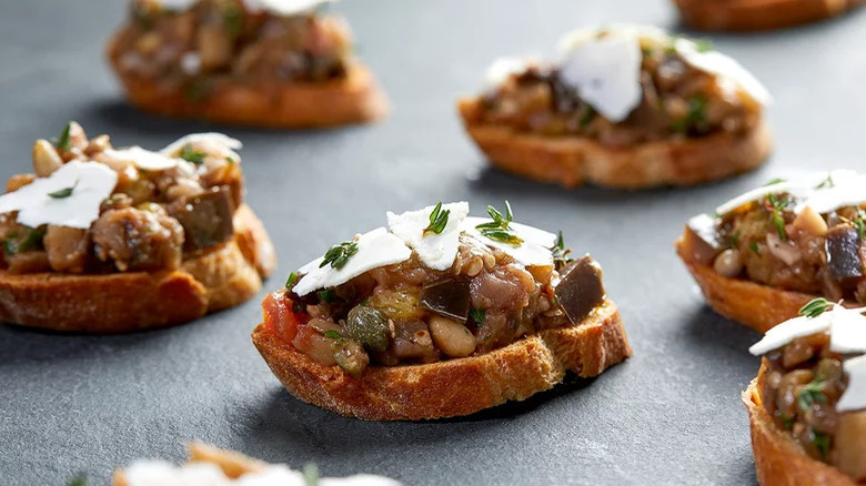 The good news is that preparations can easily be made ahead, ensuring you're not stuck in the kitchen when it's time to catch up with your guests. On the day of your gathering, just warm the caponata if preferred or serve at room temperature, spooning it generously over the crostini. A sprinkle of thyme leaves and crumbles of ricotta salata amplify its taste and presentation further.