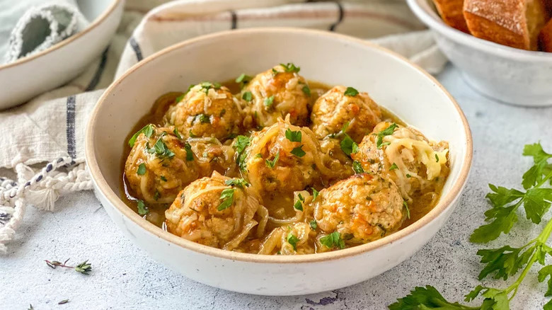 French onion chicken meatballs fuse classic French flavors with the ever-popular meatball, catching attention at any gathering. The deep, rich aroma of caramelized onions melds with the robust flavor of Gruyère cheese, encasing tender chicken meatballs. It's a bold twist on the beloved French onion soup, transformed into a bite-sized delight that works perfectly as a hors d'oeuvres.