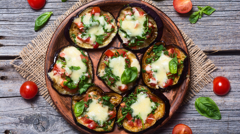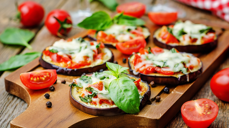 If you're looking for something with a similar flavor profile that's easier to make, try your hand at eggplant pizza. Sure, the vegetable works as a topping for the pie, but instead of doing that, replace the entire crust with eggplant. Slicing up the veggie and layering sauce, cheese, and toppings gives you your own set of low-carb personal pizzas. Eggplant is mild, so it won't change the taste of pizza entirely — instead, you can focus on the mozzarella, marinara, and pepperoni or parmesan, pesto, and prosciutto that adorns your eggplant.