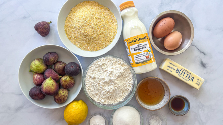 To make the cornbread, you'll need butter, sugar, eggs, flour, cornmeal, baking powder, baking soda, salt, vanilla, and buttermilk, plus some fresh figs to go on top. In addition to these ingredients, you will also need lemon juice and honey for the glaze.
