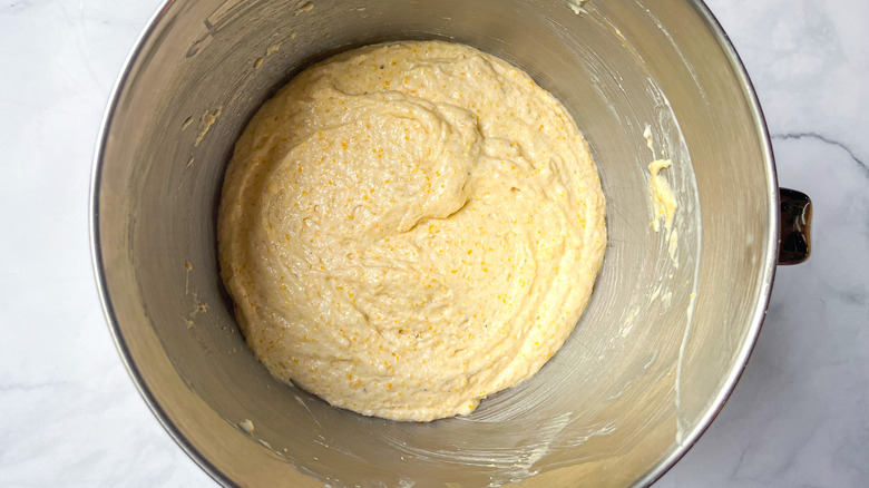 Before you start stirring up the batter, set the oven to 375 F, then take a small amount of the butter and use it to grease a 9-inch cast iron pan. The rest of the butter is to be creamed with the sugar — about 3 minutes of beating should make it nice and fluffy if you're using an electric mixer of some sort, although you might need to beat a bit longer if you're mixing by hand. After you've achieved fluffiness, beat an egg into the butter mixture, then scrape the sides of the bowl. Repeat the process until all of the eggs have been used, then mix in the cornmeal.