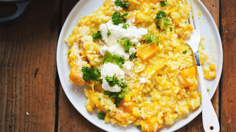 Contrary to popular belief, starch is a desirable aspect of rice used in many culinary traditions, like mango sticky rice, rice pudding, and savory rice cakes. Risotto is an indulgently creamy rice dish, originally from Italy, that coaxes the natural starches out of arborio rice with the help of butter, wine, and broth. A dash of heavy cream and grated parmesan are the often final touches that enhance risotto's creaminess. If you thought risotto couldn't get any richer, a dollop of ricotta will launch risotto into the next realm of decadence.