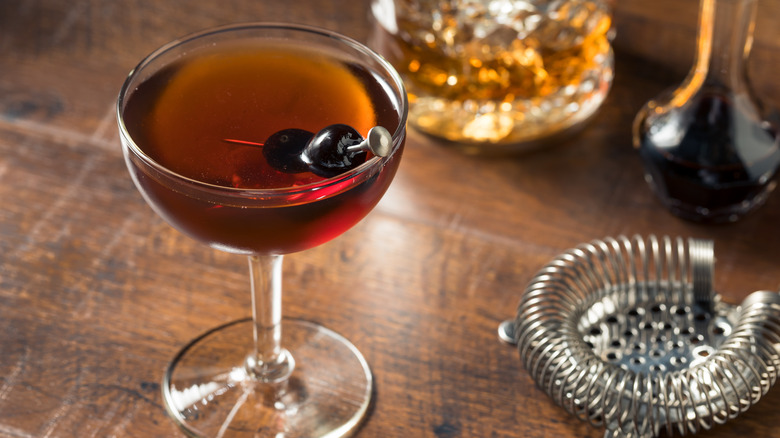 The Manhattan cocktail is a truly classic drink. Consisting of only whiskey, vermouth, bitters, and cherries as a garnish, it's as easy to make at home as it is to enjoy. In fact, a primary selling point of the drink is its simplicity, which means any twists have to walk the line between bringing something new to the table without overwhelming its original charm. With that in mind, we recommend one small innovation for your Manhattans this fall: add pumpkin spice.