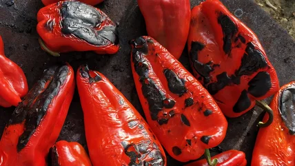 The bright red color and rich roasted flavor of jarred peppers start as mild bell peppers that are charred to roast the flesh, then peeled, and packed in salty brine. All of the tedious work of removing the seeds and stems is done for you too! Using roasted peppers from the jar can save you a lot of prep time in the kitchen. You'll find whole peppers, strips of roasted peppers, and even pre-marinated peppers at the grocery store –- maybe you'll want to bring home a jar of each for variety.