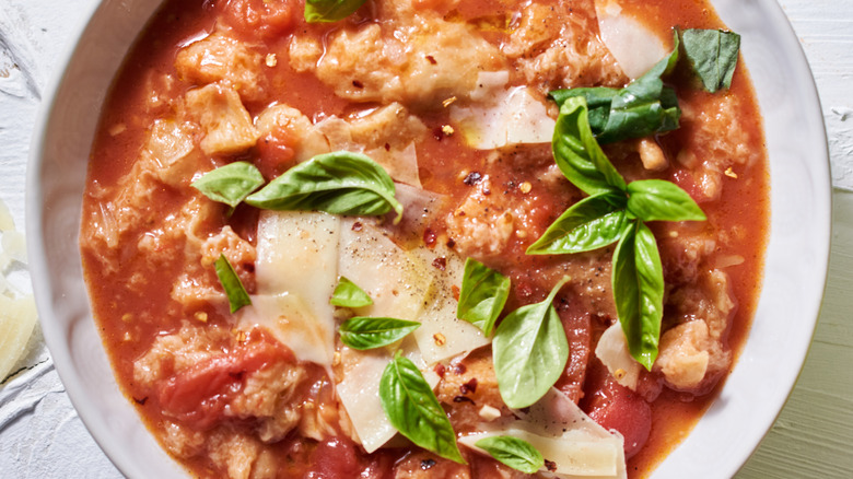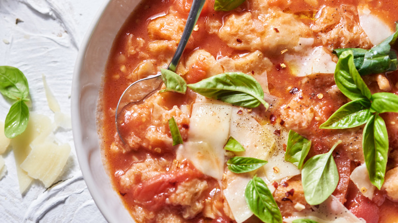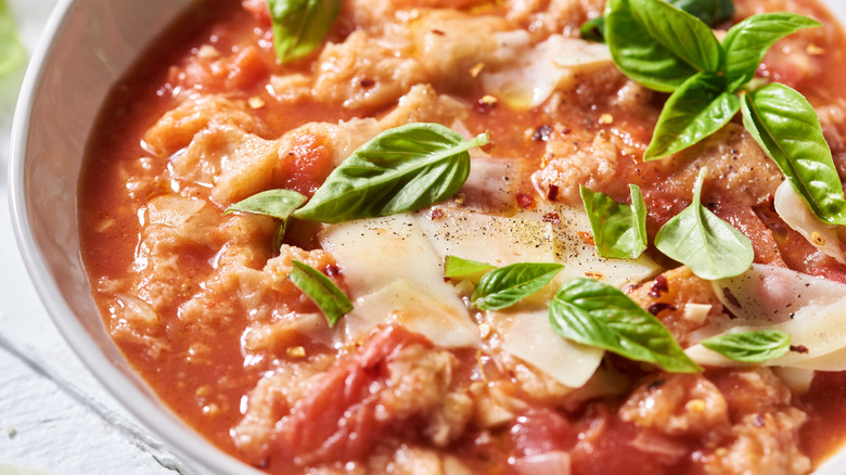 Because pappa al pomodoro is made with bread, it's very filling and can serve as a meal on its own. After all, it was originally intended to feed Italian farmers with large appetites and a need to stretch every dollar. You can enjoy this soup on its own with crisp white wine for summertime — try chilling the pappa beforehand for an extra refreshing meal — or dry reds for winter. It also makes a great side dish to hearty meat dishes, such as chicken parmesan, large homemade meatballs, or roasted porchetta.