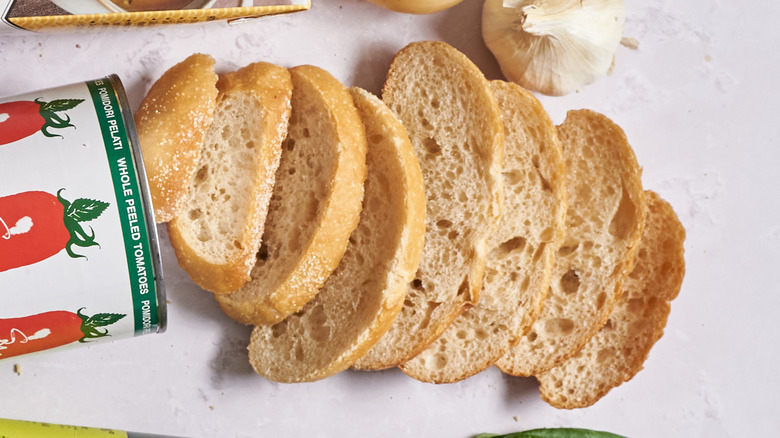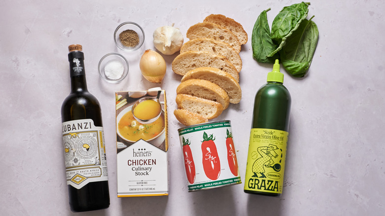 Grab the best olive oil you can get your hands on (extra virgin is ideal), along with onion, garlic, white wine, and crusty bread. Then, pick up some chicken broth, whole canned tomatoes, salt, pepper, and basil. We suggest seeking out San Marzano tomatoes, which are believed to be sweeter, less acidic, and fresher tasting than other canned varieties. Of course, unless you're a tomato connoisseur, the difference is minimal, so you can use any whole peeled tomato or tomato puree you love.