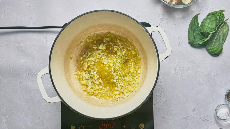 - Add the onion and garlic and sweat until very soft, stirring occasionally, about 5 minutes.