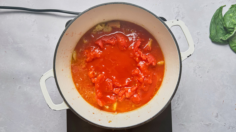 - Add the tomatoes, crushing by hand to create a puree. Bring to a simmer and cook until thick, about 5-10 minutes.