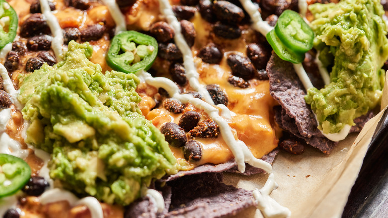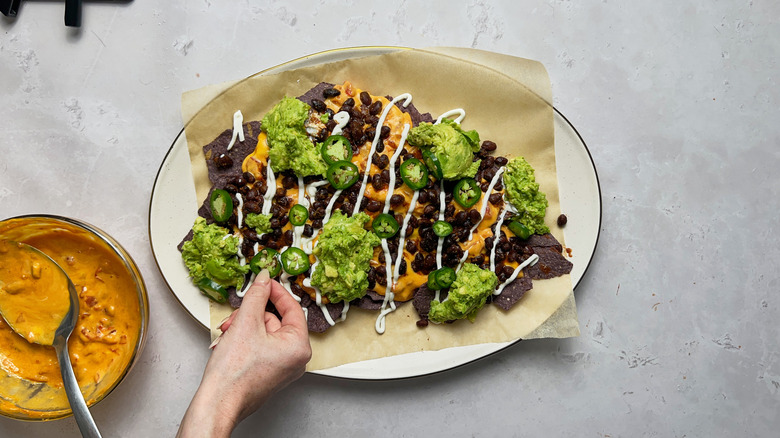 You can get creative with the toppings, adding things like sliced black olives, shredded lettuce, or pickled red onions. You can also double up on the cheese, adding another layer of freshly shredded pepper jack, cheddar, or monterey jack cheese over the queso. No matter what toppings you decide on, the nachos should be eaten immediately — no leftovers, as the queso makes the chips soggy overnight. However, to save some time when making these, you can prep the queso and black bean mixture ahead of time. That way, the queso will only need a quick zap in the microwave to come back to life.