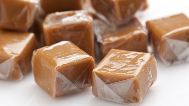 To make your salted caramel Rice Krispies treats, you'll need both soft caramel candies and caramel sauce — like the type you'd drizzle on top of ice cream. Melt your butter down with sweetened condensed milk and add the caramel candy pieces. You'll need to babysit this mixture as it cooks for a few minutes since caramel is notorious for sticking to everything. Once the caramel is melted, add your marshmallows and make the rest of your treats. You'll want to add your caramel sauce to the tray of Rice Krispies treats while it's still warm. Allow your treats to harden for about half an hour before slicing and serving.