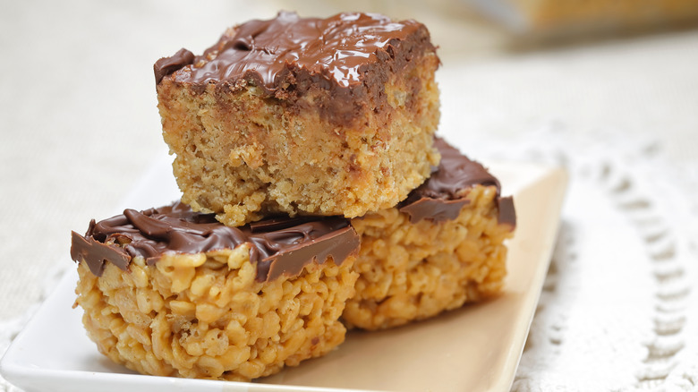Even if you're not veering off the Rice Krispies treat path with Scotcheroo, you should still consider adding peanut butter to the traditional recipes. The salty, sticky, and filling spread adds a novel flavor element to the dessert. You can play with the texture of it depending on what type of peanut butter you enjoy eating. For example, if you go the crunchy route, you can add extra chopped peanuts to your bars to make them more nut-forward.