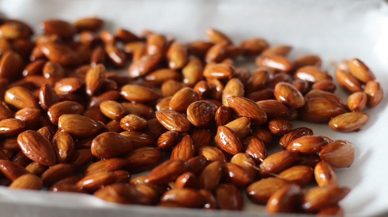 After you roast the nuts for seven minutes, Garten recommends making the caramel on the stove while they cool. This is easier than it sounds — all you need to do is cook sugar and water in a pan without stirring after the two are combined. Then the vanilla gets added in, the caramel gets poured onto the nuts, and the whole thing sits until it's cool to the touch. Want to modify this recipe a little? Try using brown sugar instead of white, or adding spices like cinnamon, pumpkin pie spice, or nutmeg to your caramel. If you're really looking to switch it up, try a little cayenne pepper or chili powder. Once you've nailed down your ideal flavor combo, you'll have a tasty snack that will (possibly) last the week.