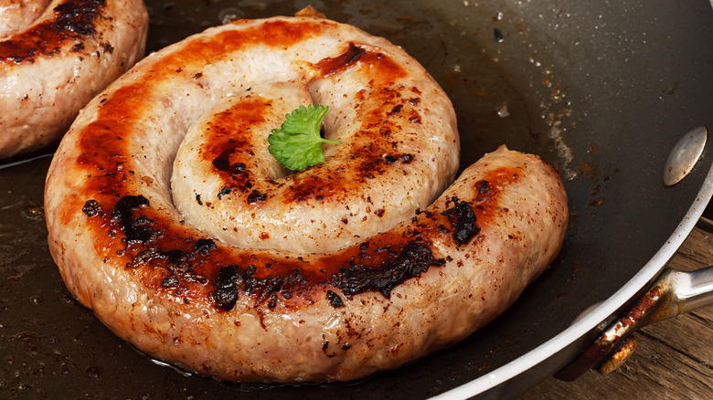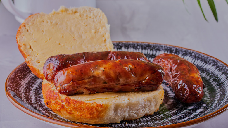 In a world that has no shortage of sausage sandwiches, the classic British sausage sarnie stands out as a testament to simplicity. Not much more than two griddled sausage links slathered in brown sauce and sandwiched between two slices of spongy white bread, the sausage sandwich is nothing short of an institution in the U.K. and Ireland. That being said, the sandwich's success hinges on choosing the right sausage. And while it's tempting to go for the most flavor-packed sausage there is, it is better to keep things simple and skip the flavored links.