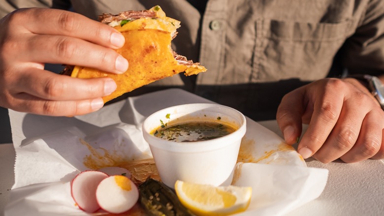 Out of all the world-famous Mexican dishes, tacos may be the most treasured. Who can resist zesty meats, seasoned with a panoply of Mexican spices and chiles, stuffed into fresh corn tortillas? Jalisco-born birria tacos stand out, featuring stewed goat or beef stuffed inside tortillas that have been dipped in the stew's broth, or consommé. The consommé-dipped tortillas are then crisped up on a flat top so they don't buckle under the weight of the birria or disintegrate.