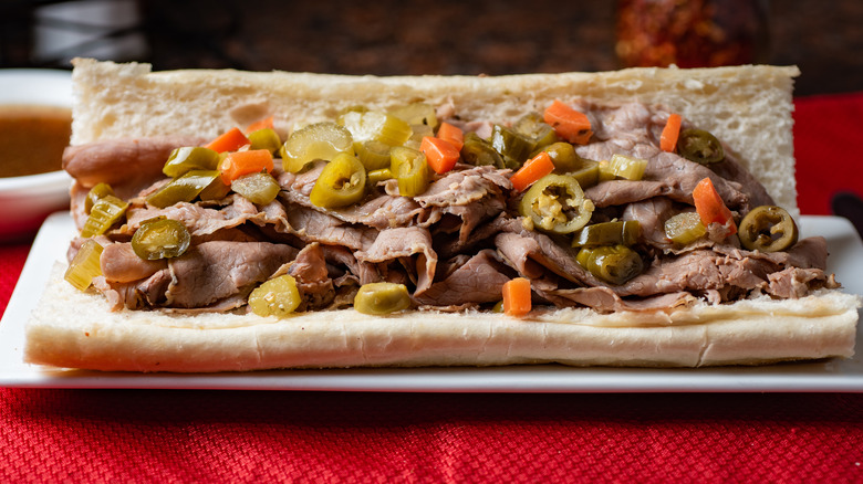 When ordering an Italian beef "dry," the beef is served with as little juice as possible. The counter person will remove the beef from the pan with tongs and pause to let the juice drain. It could be argued that with this style, the hoagie roll is less structurally crucial, but it still makes the perfect home for all that beef. For a "wet" Italian beef, the beef and its juices go directly onto the hoagie roll, soaking it in all the flavors and enhancing the overall taste. An Italian hoagie roll has the structural integrity to hold up to this juicy affair, and the pillowy insides drink up the juice while the crust keeps everything together. "Dipped" is the heavyweight of the Italian beef world. The entire sandwich is submerged in the meat juices, a true baptism of flavor. The hoagie roll, robust and unyielding, stands up to this dousing and remains a steadfast companion to the beef.
