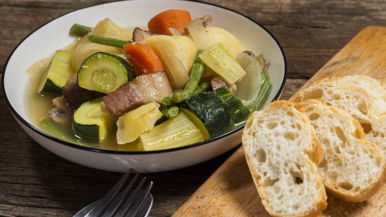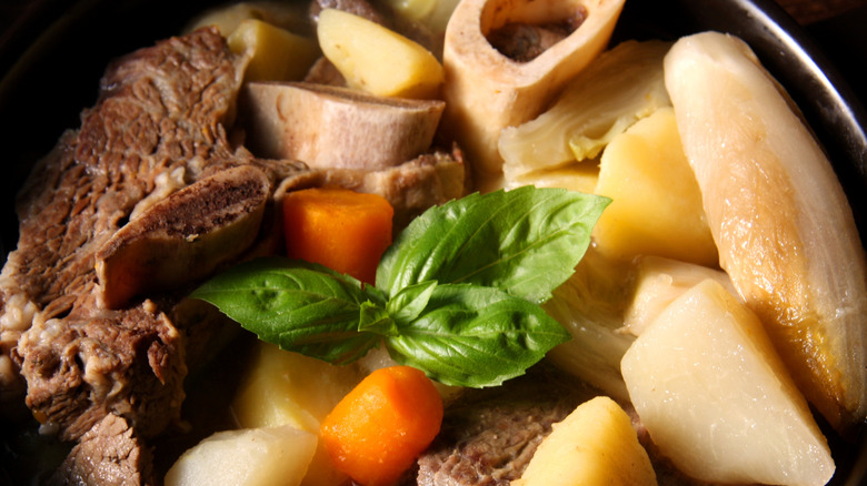 As a classic dish encompassing all of France, there are multiple regional renditions. Across the country, ingredients can include everything from chicken sausage to pork, lamb, and more. Well-known deviations include pot-au-feu à la Bourguignon, which hails from Burgundy and fittingly incorporates red wine. Meanwhile, coastal versions, known as pot-au-feu de la mer, throw in the sea's freshest catch and shine with fish and shellfish. And pot-au-feu à la Provençale incorporates the local Meddietternean flavor of herbs de Provence. Slow-cooked for anywhere from an hour and a half to three hours, pot-au-feu's secret is in the slow melding of flavors.