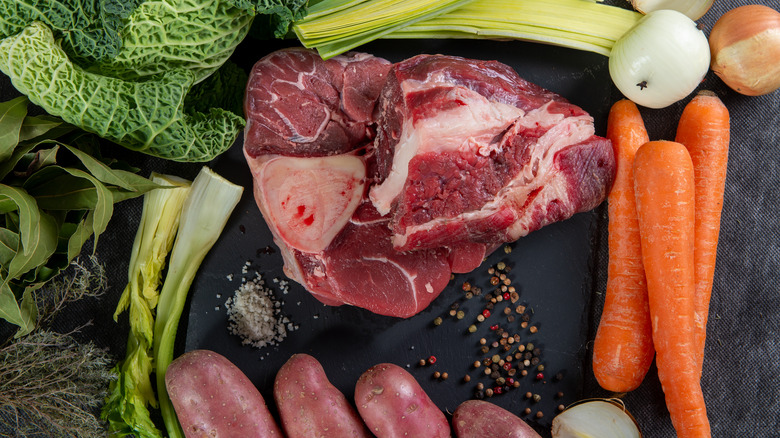 Pot-au-feu's essence is in slow cooking a variety of components. The hearty stew traditionally uses beef bones, a few meat cuts — a larger assortment improves flavor — as well as a selection of root vegetables. Usually, the dish integrates cuts from the leg, like beef shank, as well as ribs, rump, and shoulder. The root vegetables include a shifting assortment of potatoes, carrots, onions, leeks, celery, and turnips. Many recipes add a bright flavor with fresh tomatoes or tomato paste. Plus, a bouquet garni is tossed in, tied with thyme, bay leaves, parsley, and sometimes rosemary.