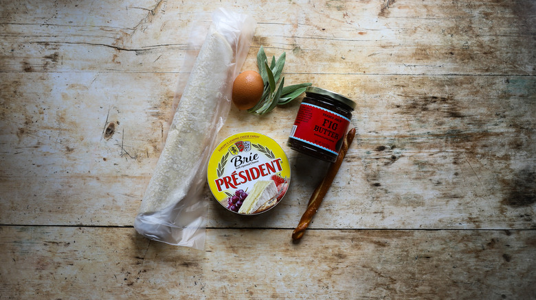 Preheat oven to 425 F. Unroll pie dough, or roll to an 8-inch circle. Gather the brie, fig butter, egg, pretzel rod, and sage.