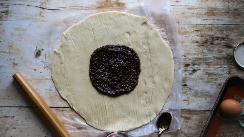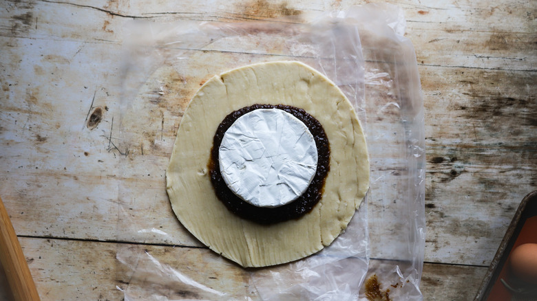 In the center of the dough, spoon the jam into a circle roughly the diameter of the brie.