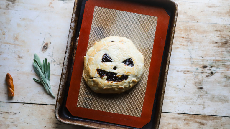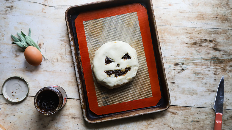 Turn the dough over and use a paring knife to cut a jack o'lantern design in the top. If needed, spoon a small amount of jam back into the eyes and mouth to fill in any holes.