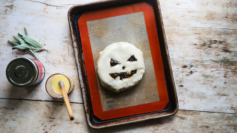 - Turn the dough over and use a paring knife to cut a jack o' lantern design in the top. If needed, spoon a small amount of jam back into the eyes and mouth to fill in any holes.