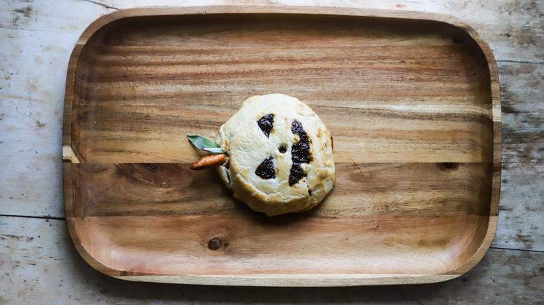 The main ingredients needed for this board are an 8-ounce wheel of brie, fig butter, and refrigerated pie dough. The fig butter could be any jam of your choosing, but a darker jam will make the jack-o-lantern's face pop. We used an egg to brush onto the pie crust to give it a bit more golden brown color, and a piece of a pretzel rod and a sprig of sage helped create the look of a pumpkin stem. For the rest of the board, a mixture of nuts, cheeses, crackers, fruit, and salami is needed, but the exact items are up to you.