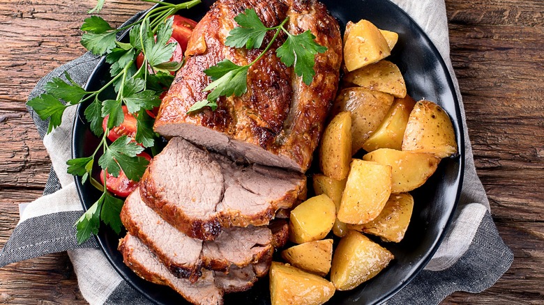 Once browned, transfer your pork loin to the oven for part two: slow cooking. By cooking your pork loin on low heat for a longer period of time, you ensure that the center won't get overcooked. If you have a slow cooker, you can skip the oven and just use that. You'll want the pork to have a faint trace of visible pink left in the center. Aim for a temperature of 145 degrees Fahrenheit per the United States Department of Agriculture (USDA). Then remove it from the pan and allow it to rest for about 10 minutes (where residual heat will continue the process) before you serve it.