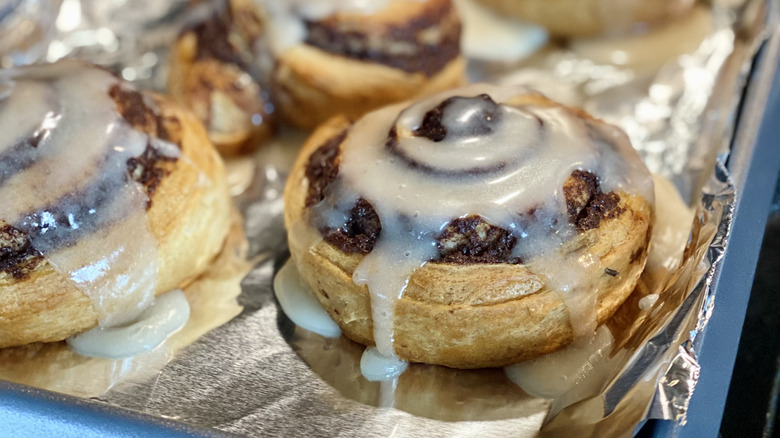 Store-bought cinnamon rolls are a fantastic, convenient option to have on hand. You don't have to mix yeast with water, wait hours to let it rise, then begin making the filling and rolling everything together like you do with homemade cinnamon rolls. You can buy the refrigerated ones that require some time in the oven or certain grocery stores have bakery sections where you can purchase ready-to-eat cinnamon rolls. The only qualm with buying rolls in-store is that they can be hit or miss. There's often something lacking, whether it's on the dry side or there's not enough icing.