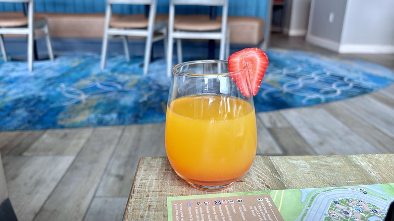 I got a mimosa a few more times while we were at the lounge, and it was always a POG mimosa. POG stands for passion fruit, orange, and guava, and the juice is pretty popular around the Disney resort. You can find it at many breakfast locations, and I was really excited that our lounge was able to mix it with bubbly for a mimosa.