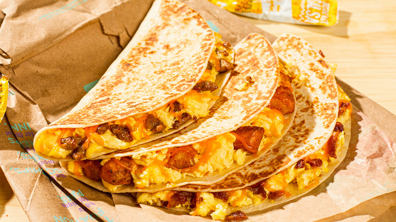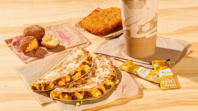 The toasted breakfast tacos join the fast food chain's already extensive breakfast menu, which offers an array of breakfast burritos, breakfast quesadillas, and breakfast crunchwraps. Many of these items include hash browns inside of them already, but you can also order hash browns as a side as well. For a sweeter breakfast option, the menu includes Cinnabon Delights, which are cinnamon sugar donut holes filled with icing. It was only a matter of time before tacos were added into the mix; they are the restaurant's namesake after all.