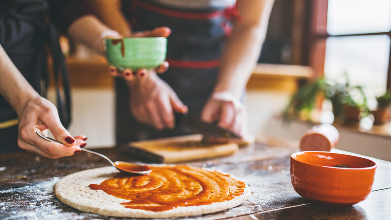 These spicy peppers are already the secret weapons in many pizza makers' arsenals, as their potent smoky spice adds not just heat, but tons of acidic flavor to all different kinds of pizza. They commonly come chopped in a jar with oil, or crushed and ground into a paste, making them easy to spoon out as a topping. You could start there and be perfectly happy, but incorporating Calabrian chiles into your pizza sauce will make for a truly unique experience, infusing the pepper taste and multiplying the complexity of the whole pie.