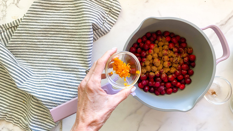 - Add the cranberries, maple syrup, orange zest, orange juice, and cinnamon into a small pot.