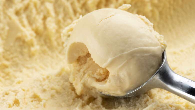 When thinking about ice cream, there's plenty of rich dairy that comes to mind, from heavy cream to milk, but rarely does one think of butter. Sure, there's the flavors that invoke the golden butter flavor, like browned butter pecan and butter toffee. But this is mostly incorporating butter through the toffee, caramel, and butterscotch sauces added into the ice cream. It begs the question — what would happen if you actually added butter right into your next batch of vanilla ice cream?