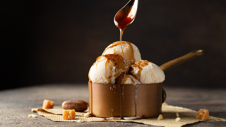 Want to double down on the butter flavor? Add in a teaspoon of butter extract. If you'd rather incorporate ingredients complementary to buttery flavors, consider folding in some toasted pecans or candied macadamia nuts, as well as toffee brittle chunks or praline bits. Even a drizzle of salted caramel would be welcome here. But just plain butter ice cream is an experience in itself — any way you scoop it, you win.