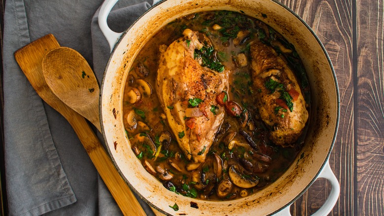 While your dish is baking, check in on it every now and then to make sure all of your liquid hasn't been cooked off. For most dishes, like pot roasts or chicken thighs, you'll want to save some of that reserve liquid for later, either to keep your meat moist or to turn into a flavorful sauce. If you accidentally over-reduce the cooking liquid, you will lose out on a potential flavor bomb for your meal. A small layer of liquid also prevents your meal from burning and sticking to the bottom of your Dutch oven.