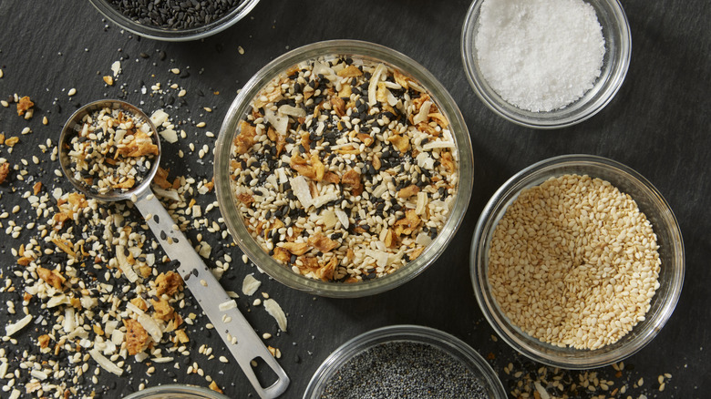 To successfully incorporate the garlicky flavors of your sesame seed blend into your golden, crispy latkes, give it a taste first. Some everything seasoning mixes have more salt than others, so be sure to try a little to gauge whether you'll need to omit the salt in your standard latke recipe (here's a great recipe for everything seasoning if you'd like to make your own blend). Then place your wrung-out shredded potato and onions in a large bowl, along with the dry ingredients, such as breadcrumbs or matzo meal, and eggs before sprinkling over your everything seasoning. Give the whole lot a good stir to ensure an even distribution of seasoning throughout your potato mixture. Finally, form the potatoes into patties (you aren't looking for uniformly neat edges here but a craggy outline to create optimum crunch when fried) and cook in a pan of hot oil until the exterior is crispy and the middle is deliciously tender.