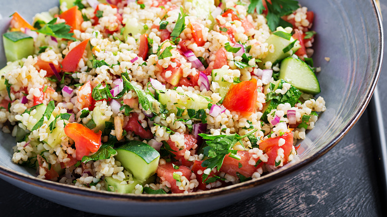 The food processor isn't just suited for hard vegetables like celery and potatoes. It can also chop up leafy greens like kale or romaine. Just roll up the greens so that they're bunched together tightly, and put them through the processor like you would anything else. The food processor can even handle chopping up different veggies at once. For example, you could pulse together some cucumber, onion, mint, and tomatoes to make a Shirazi salad right in the processor. Once you've made your salad, be sure to store it correctly so it stays fresh before you dig in.