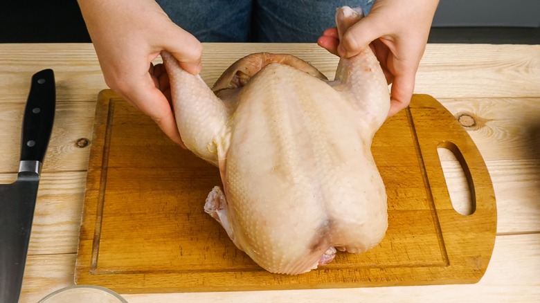 To start, you'll want to hunt for the joints on a chicken, and really any cooking bird, because it's way easier than cutting through bone. Plus, whenever you cut directly through bones, they may splinter into fragments which can get caught up in your cuts. When slicing through the joints, you make clean cuts straight through the connective tissue. As a result, you get nice, even, whole cuts.