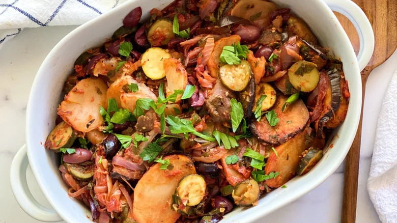You can make your own by packing your baking dish full of zucchini, potatoes, eggplant, red onion, garlic, and olives. When it all comes together, it's deeply flavorful but still light enough to eat any day of the week.
