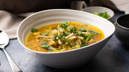Traditionally served either as a meat or a vegetarian dish, this version of mulligatawny, created by recipe developer Jennine Rye, uses chicken thighs to give the soup a meaty and hearty flavor. Perfect for lunch or dinner, this soup can provide a great immunity boost if you're feeling under the weather, and is easily scaled up if you're catering to a large group, or looking for a good meal to prep ahead of time and store in batches.