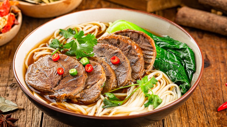 Chicken noodle may be the go-to comforting soup in the U.S., but another meat-based variant is no less delicious. Popular in China and even more so in Taiwan, such a hearty creation is full of flavor. When prepared properly, it's loaded with tender chunks of beef, bok choy, and pickled mustard greens. The contained noodles — typically wheat — are springy, perfectly melding into the soup. And despite its beef base, the broth is light and bursts with a bouquet of delicious spices.