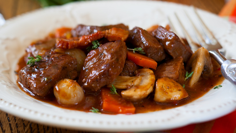 The beauty of beef bourguignon is that, much like other stews, it's a well-balanced meal conveniently built into one package. You've got the wine-braised beef, you've got vegetables, you've got a rich, meaty sauce — and if you serve this up at a dinner party, you've got bragging rights, too. Fans of mushrooms will also love this one, as you'll find the fungi as a staple ingredient in this fine French creation.
