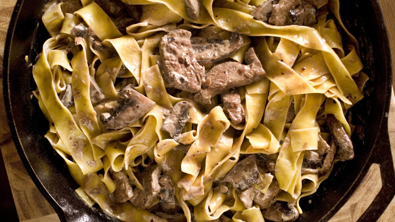 The dish is most recognizable thanks to thick noodles (egg noodles work well) and thinly sliced beef. There's no one cut of beef that works best, so if you're looking for an inventive way to use up that not-so-expensive steak, stroganoff is the solution. And, of course, don't overlook the rich and creamy sauce, which is made possible mostly thanks to that handy sour cream and beef broth.
