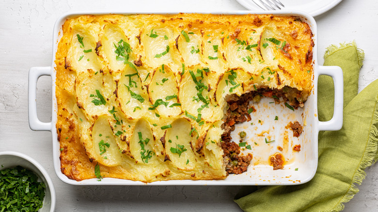 There's a whole lot to love about cottage pie, especially if you're a fan of ultra-savory, comforting meals. Though you can get creative with your pie filling, you'll typically find beef and an assortment of vegetables at play. Of course, no cottage pie filling would be complete without the layer of mashed potatoes slathered on top, which also conveniently makes this a whole meal packed succinctly into one baking dish.